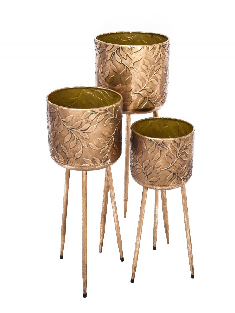 There are countless ways to enjoy this set of bronze planters. With a verdigris finish and embossed texture, the set of 3 stands on tripod legs for a unique accent piece. The different sizes offer plenty of choices for display. Indoor and outdoor safe.