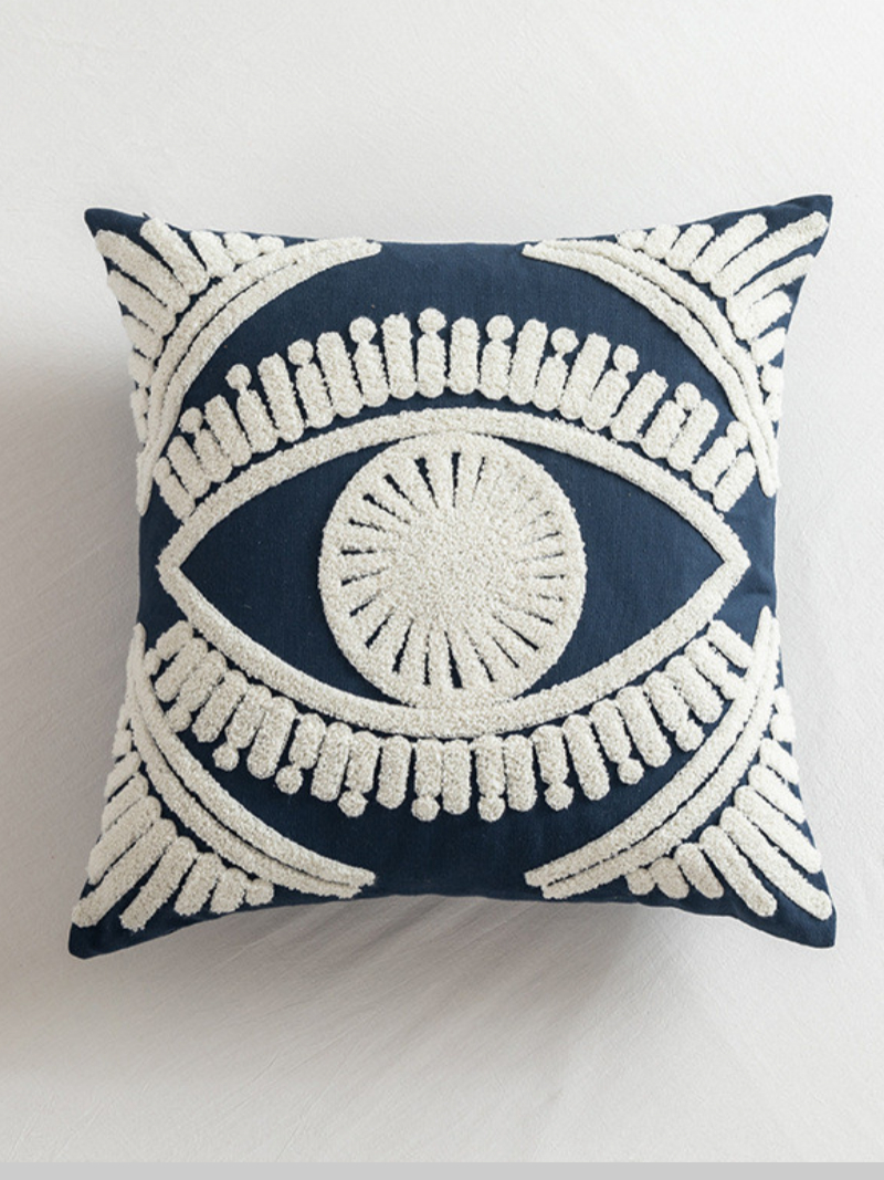 Embroidered Cushion Cover Geometric Cotton Canvas Square Home Decorative Embroidery Throw Pillow Cover 18″ x 18″ Navy Blue