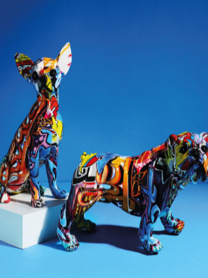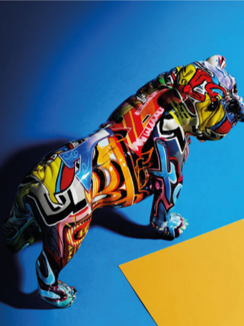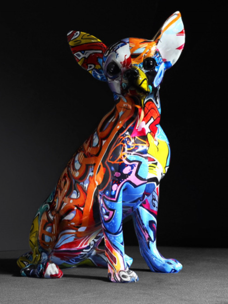 The modern piece features an abstract dog sculpture with graffiti design skin all over its body.