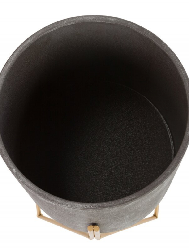 Elevate your plants and bring modern design to your home with these pot planters. They are from metal and have a drum silhouette that sits on an open base with three v-shaped legs. The pots have a distressed grey, stone-like finish for a hint of rustic charm. These planters don't have any drainage holes, so you don't have to worry about water leaking out onto your floors. We recommend adding pebbles at the bottom of these planters to promote root health. They measure 20* and 24* tall. making them ideal in the corners of your living room or entryway.